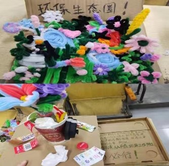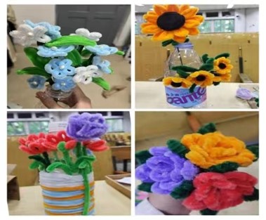 各组成员通过网络搜索教程等方式,结合自身的创意,充分发挥想象力和创造力,用扭扭棒做出各式各样的作品,每一份都是精心制作而成。利用矿泉水瓶做花瓶的向日葵花束,也有利用废纸盒制作手工花园,简单的材料用手左一扭,右一扭,便成为姿态逼真、傲然绽放的花朵。每一个作品不仅是活动成员的创意和心血,还展示了环保意识,加深了此次活动的主题。