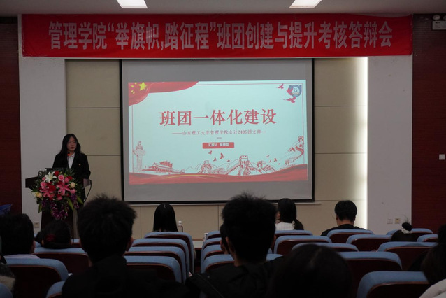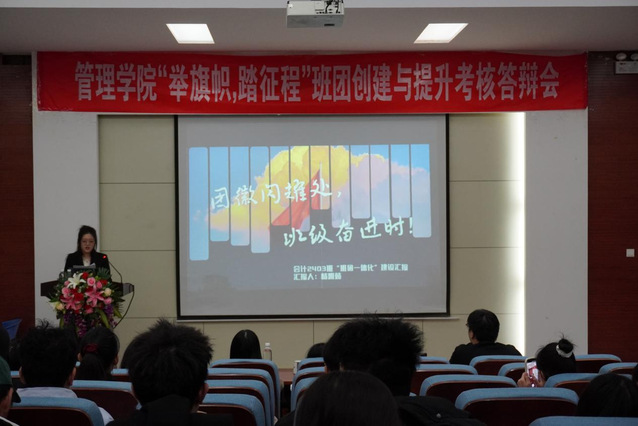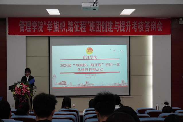 为进一步提升团支部活力,推动学院班团一体化提升建设工程,12月26日下午,我院于四教二楼报告厅举办“举旗帜,踏征程”班团一体化建设考核答辩会。本次活动由团建事务工作常驻志愿者李雨轩主持,团委老师靳祺、索罗丹、高琦、团建事务部负责人陈钲出席并担任评委,2024级部分学生干部参加。
