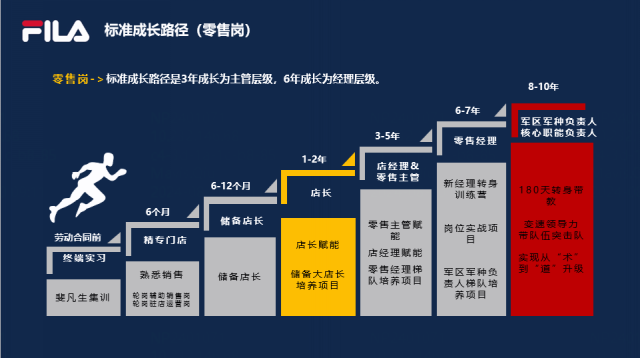 在经历零售终端实践,商品/陈列/培训/营销等岗位轮岗后,积累和掌握管理区域及提高生意的能力,将成长为军区军种(办事处/事业部负责人)及核心职能的高管储备梯队: