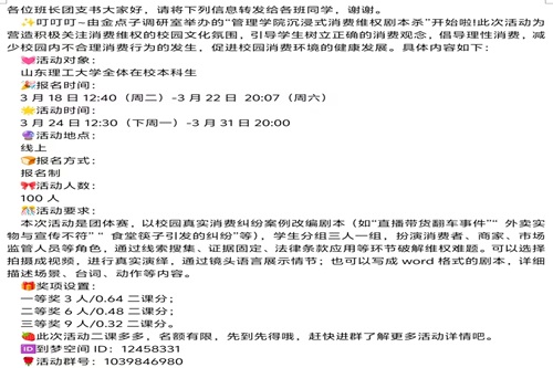 此次消费维权情景演绎活动由金点子调研室于线上举办,报名时间为3月18日至3月22日,活动时间为3月24日至3月31日。在活动举办前,管理学院金点子调研室社团积极宣传,通过多种途径在校园中广泛宣传,吸引了大量同学积极踊跃地参与本次活动。