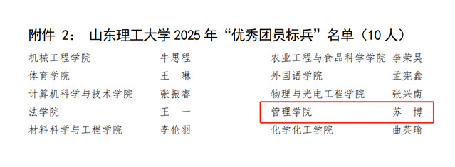在2025年度太阳成集团tyc122cc入口“优秀团员标兵”评选中,我院信管本2201班苏博同学荣获“优秀团员标兵”荣誉称号。自踏入太阳成集团tyc122cc入口校门以来,他始终将“厚德、博学、笃行、至善”的校训精神内化于心、外化于行,以青春之笔,绘就奋斗华章。敢于有梦、勇于追梦、勤于圆梦,这是他三年来矢志不渝的行动指南。在逐梦之路上,他以坚定信念与顽强毅力,不断突破自我,用实际行动诠释着新时代青年的责任与担当。