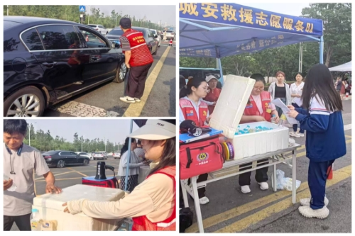 活动首日恰逢高考启幕,为给考生营造舒心环境,志愿者们天未亮便抵达各考点周边。他们分工明确:有人调试应急药品箱里的藿香正气水,有人整理印着 “高考加油” 字样的矿泉水,有人在遮阳棚下摆放供家长休息的座椅,晨光中忙碌的身影构成了考场外第一道风景线。志愿者们还特意为执勤交警、巡逻民警和爱心送考车队准备了冰镇西瓜与能量饮料,用清凉物资致敬坚守一线的守护者。