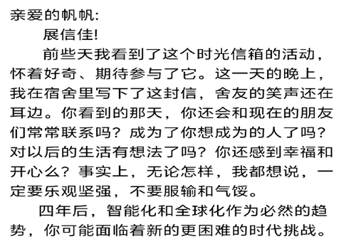 成员们以文字寄托对未来的憧憬,用声音赋予文字温度,将对自我、对时代的展望封装进“时光信箱”。活动伊始,社团通过线上线下渠道广泛宣传,吸引众多成员报名;随后,参与者围绕“个人成长与时代未来”的主题,撰写寄语并录制朗读音频;紧接着,社团对所有作品进行整理归档,完成“时光信箱”的封存仪式。